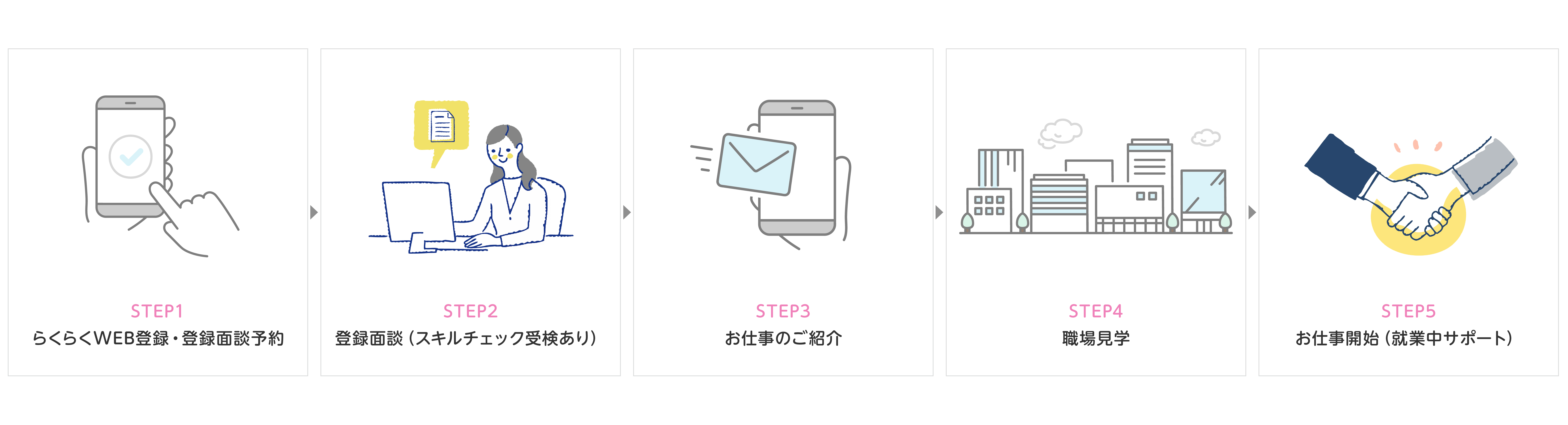 ご希望の条件に合うお仕事をすぐにご紹介できる場合もありますし、お仕事の内容によってはしばらくお待ちいただくこともございます。