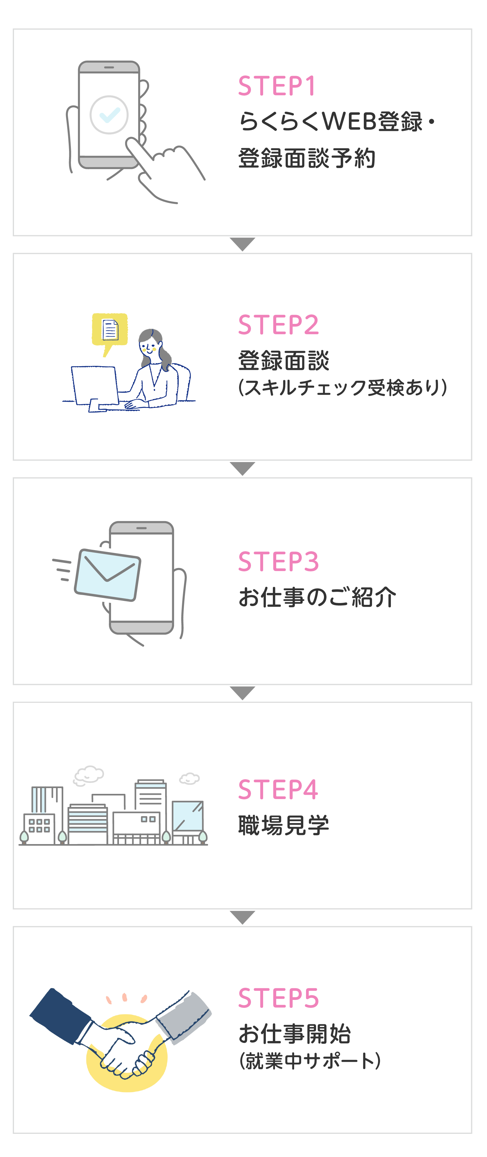 お仕事が決まった後も、私たちのサポートは終わりません。専任の営業担当があなたに寄り添い、どんな些細な悩みも丁寧にサポートします。仕事の相談から将来のキャリアプランまで、いつでも頼れる存在がそばにいるので、安心して働き続けられます。